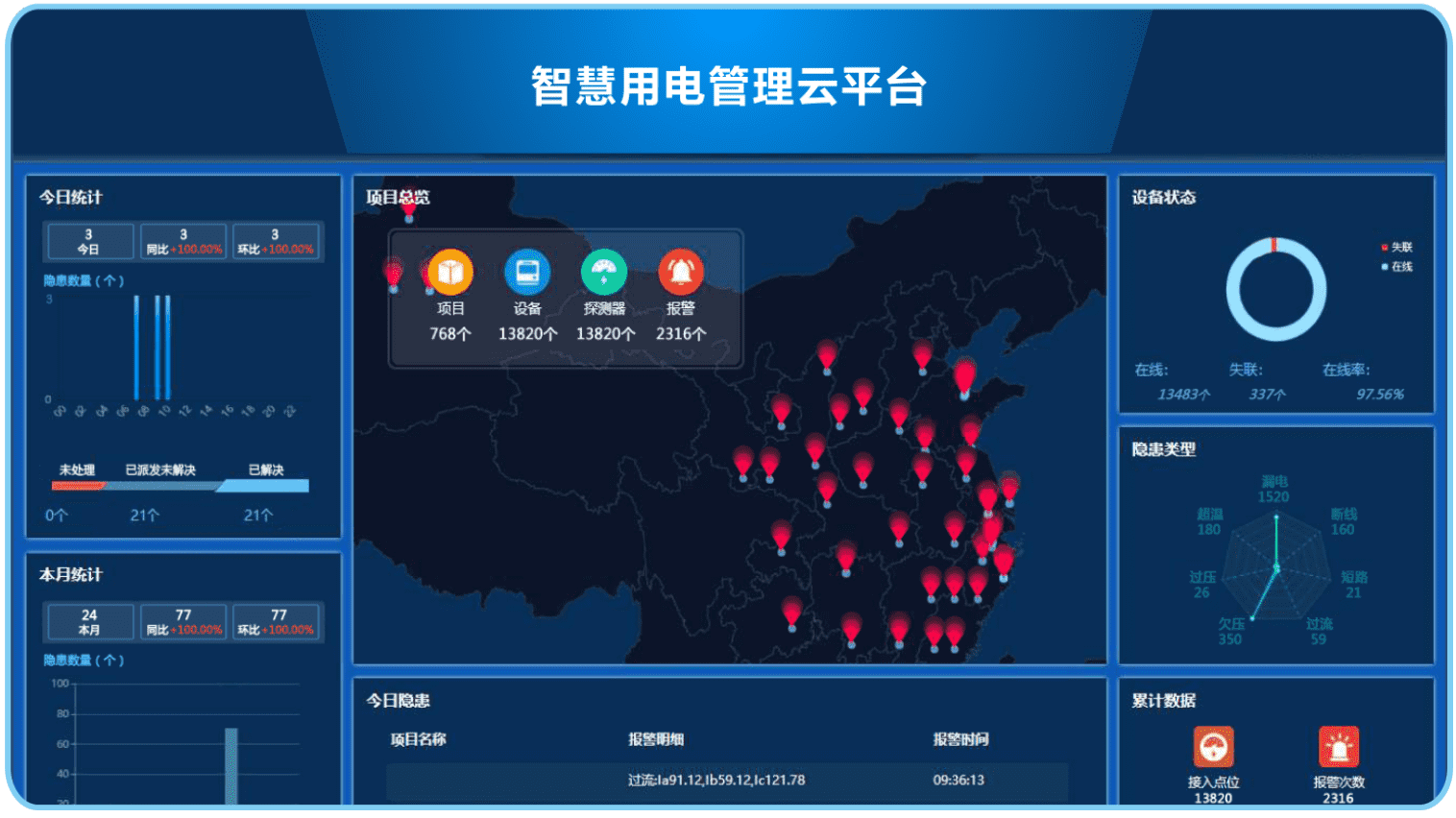 4.大数据分析基于大数据的分析处理,多维度预测电气安全状态趋势,为用户进行电气安全评估、隐患分析、系统优化、能效管理及整体用能情况提供强大的数据支撑;
