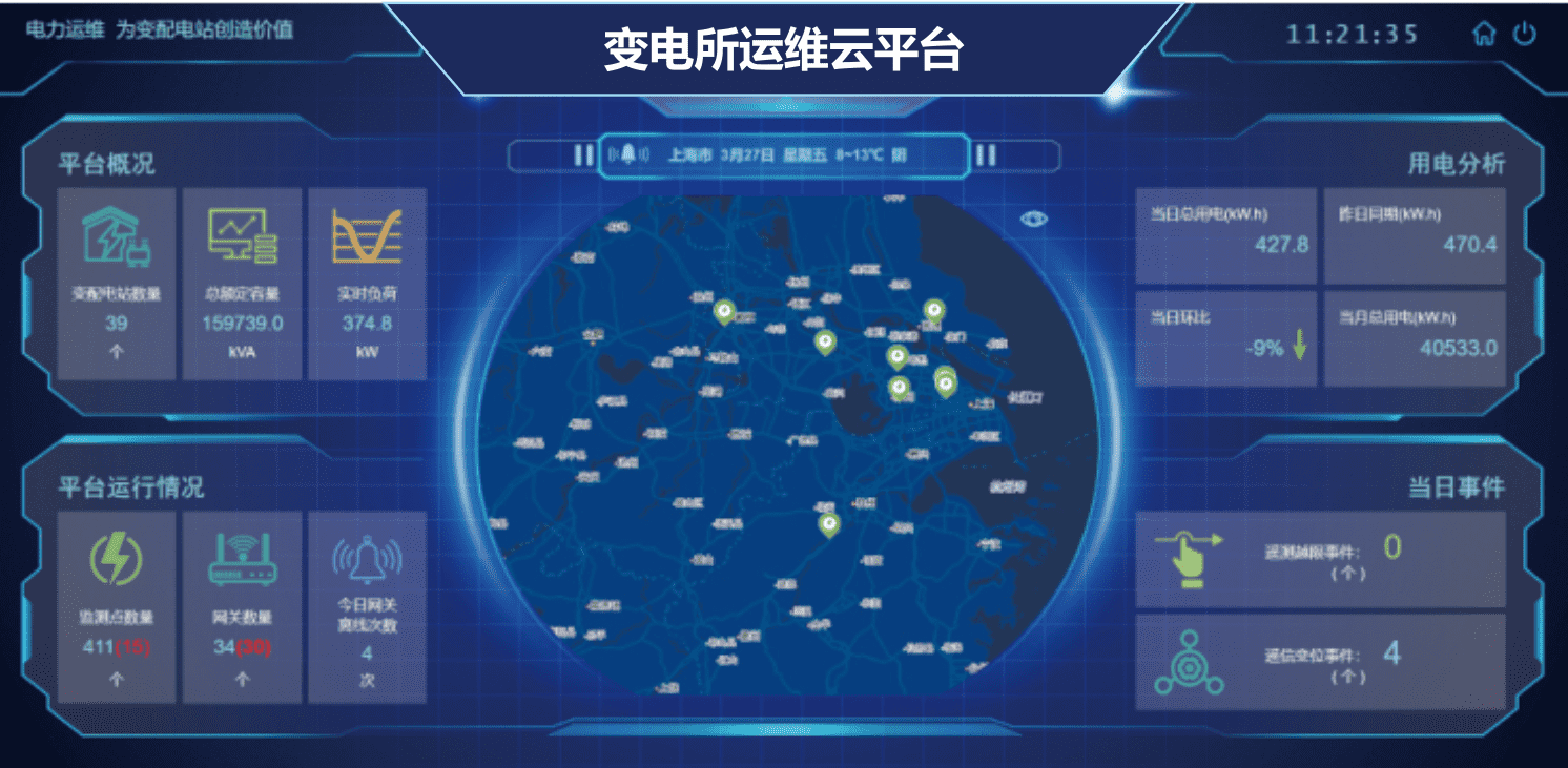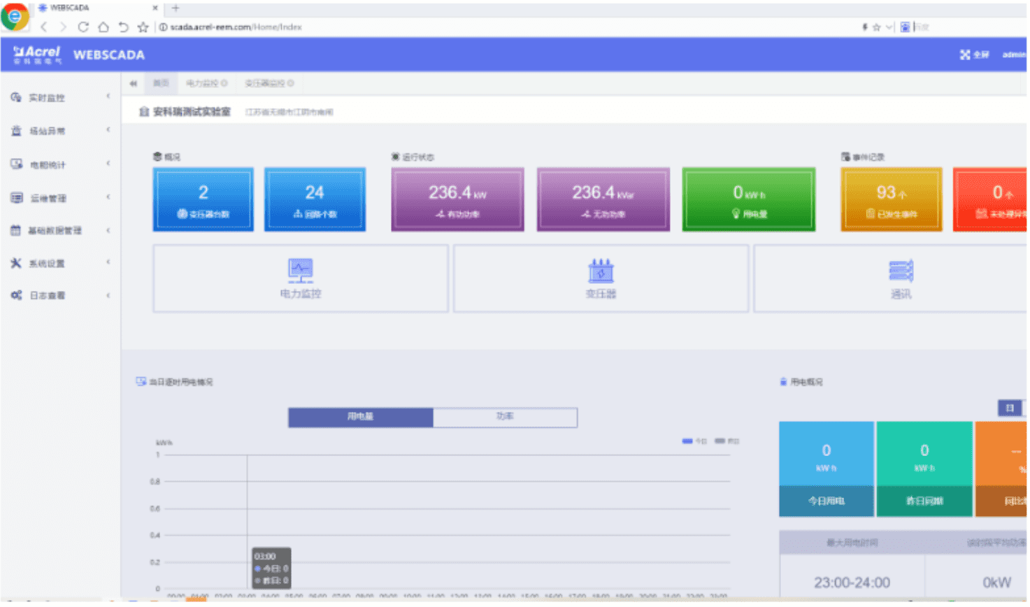 展示页面显示变电站数量、变压器数量、监测点位数量等概况信息,设备通信状态,用电分析和事件记录。首页显示场站的变压器数量、回路个数、有功功率、无功功率、用电量、事件记录等概况信息,可通过实时监控、变压器、通信、视频切换到需要查看的界面。