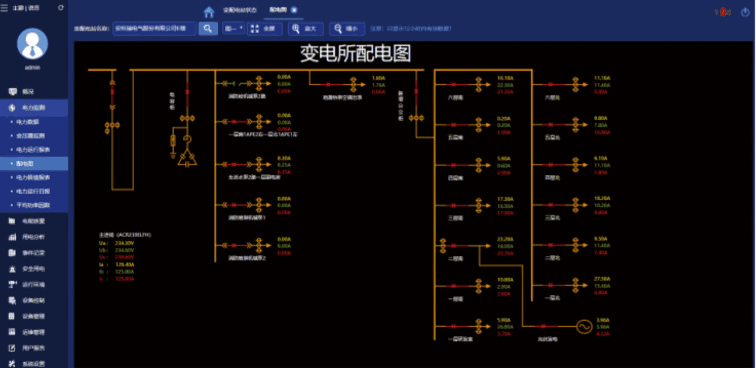 通过矢量配电图实时监测变电所用电情况, 画面响应遥信变位、遥测越限报警, 点击某个配电回路后可以查询该配电回路的各类详细用电参数, 包括实时值、最小值、最大值、平均值;