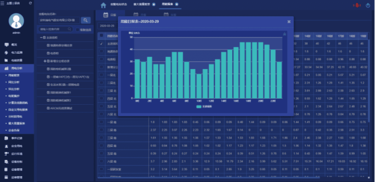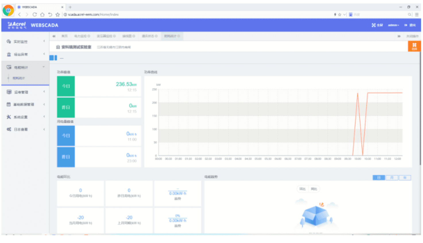 能耗统计页面显示各回路的功率峰值和用电量峰值,功率、电能趋势曲线,电能环比,用电排名。