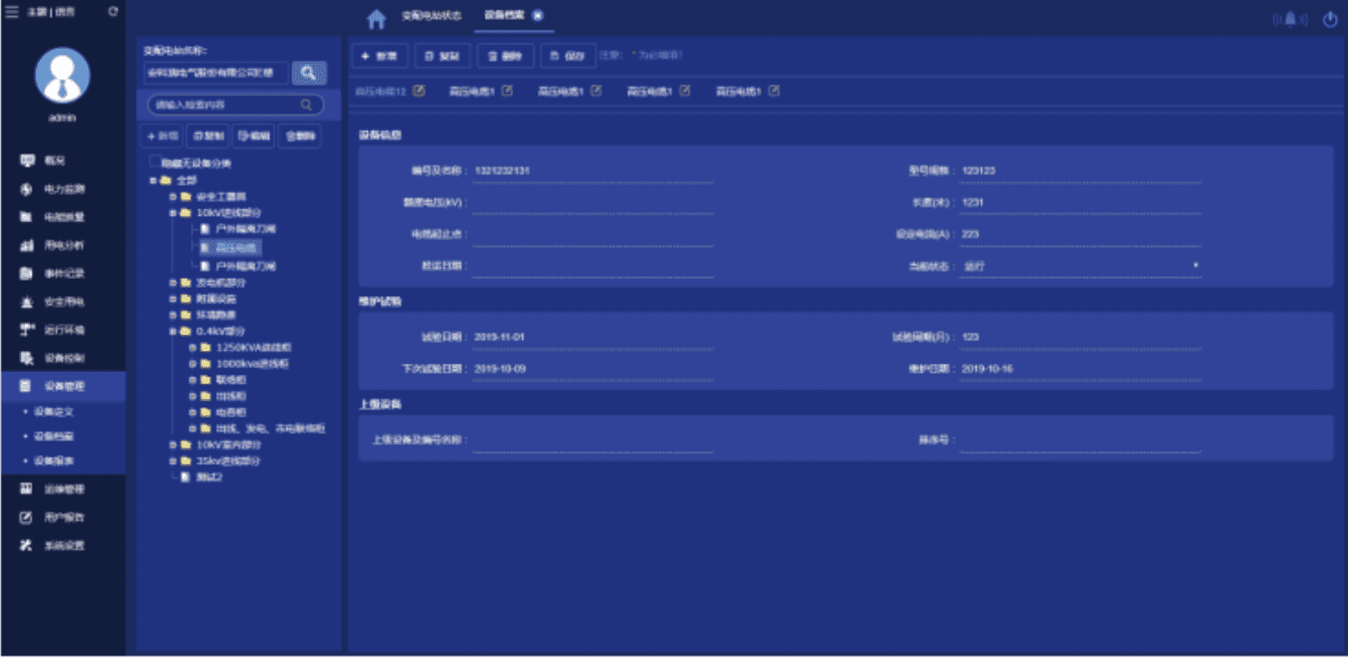 系统可配置每个变电所内变压器、进线柜、出线柜、计量柜、高压电缆等设备信息, 记录设备的厂家、型号、投运日期等, 并可通过报表统计近期需要保养或更换的设备;
