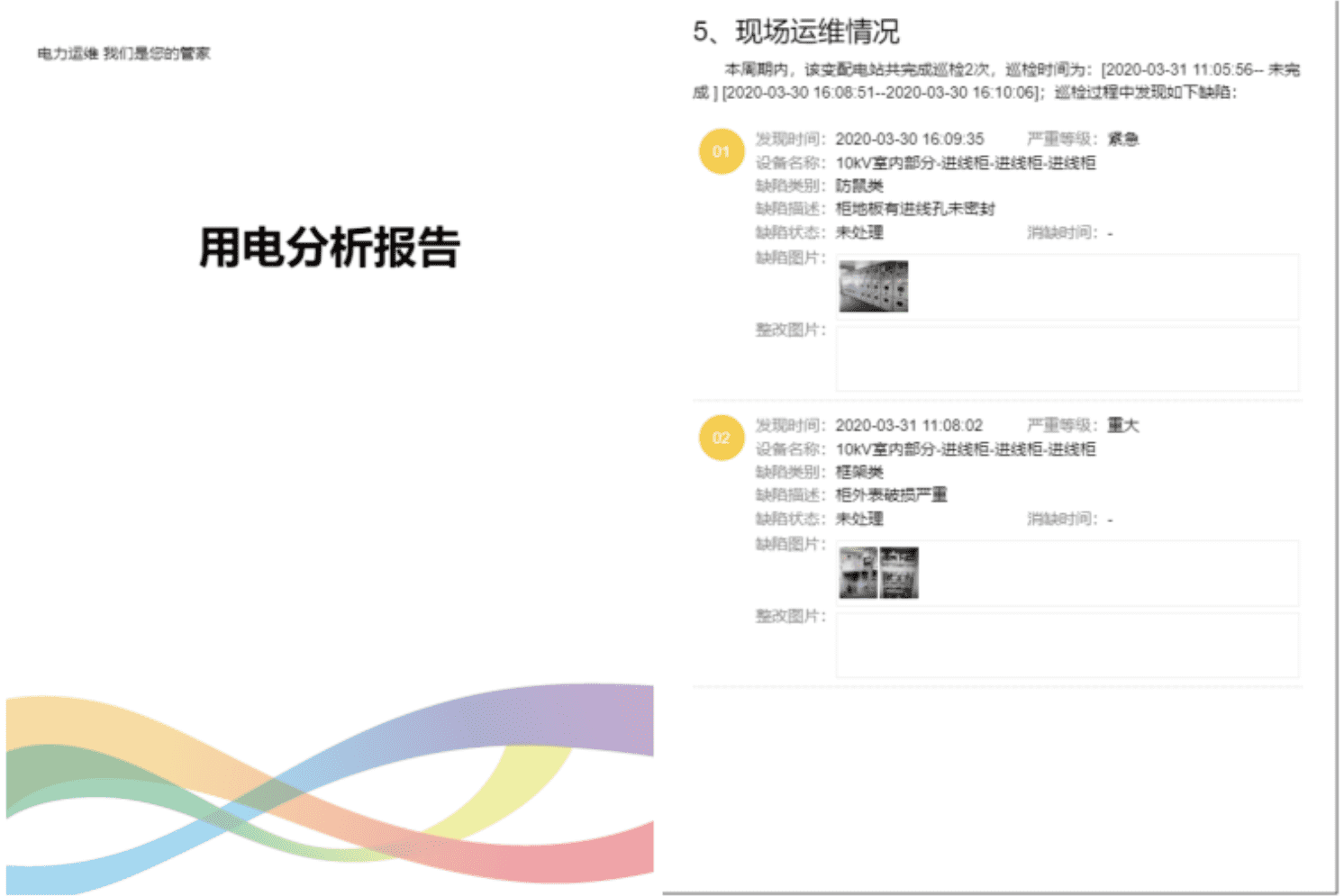 系统自动汇总变电所一个月的运行数据, 对变压器负荷、配电回路用电量、功率因数、报事件等进行统计分析, 并列出在该周期内巡检时发现的各类缺陷及处理情况。