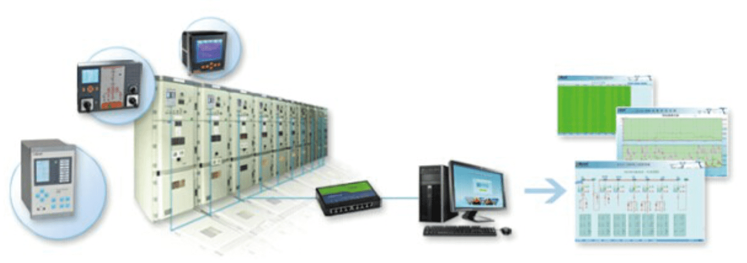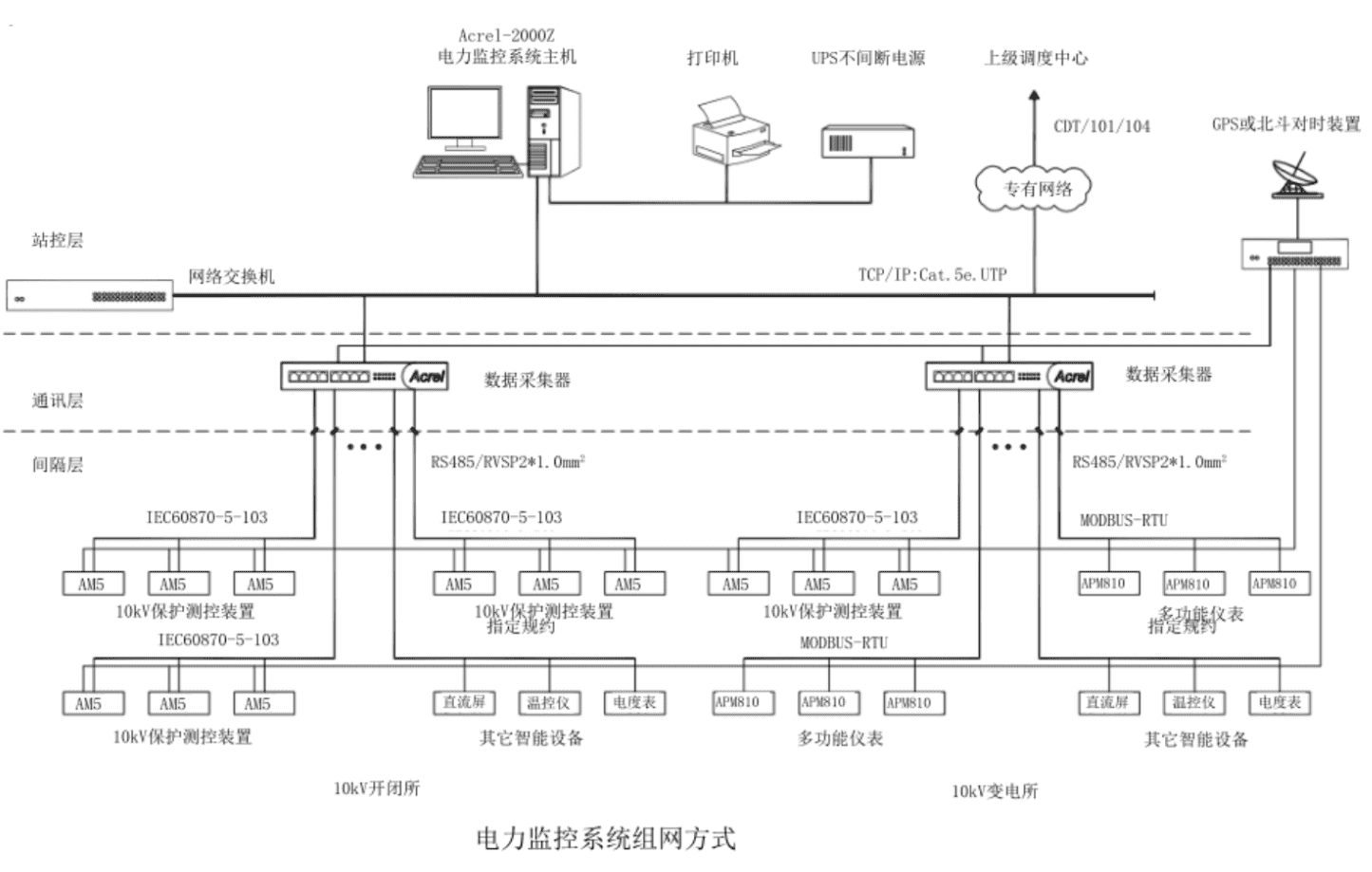 采用分层分布式设计,可分为三层:站控管理层、网络通信层和现场设备层,组网方式可为标准网络结构、光纤星型网络结构、光纤环网网络结构,根据用户用电规模、用电设备分布和占地面积等多方面的信息综合考虑组网方式。