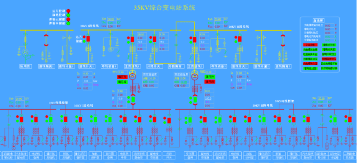 接线图页面通过一次图实时反映电气参数变化,包括遥测、遥信等信息(遥信信号需要断路器提供辅助触点支持),刷新的时间<=55。