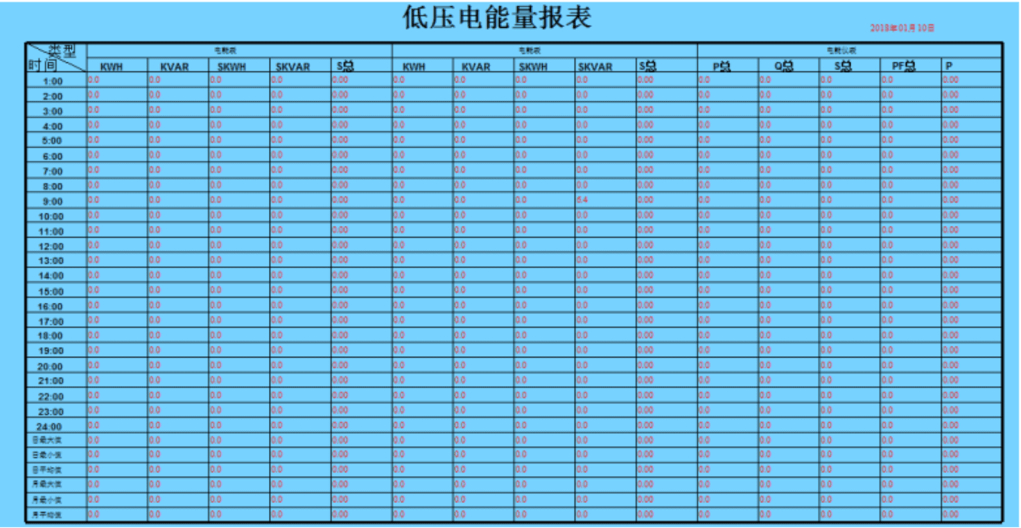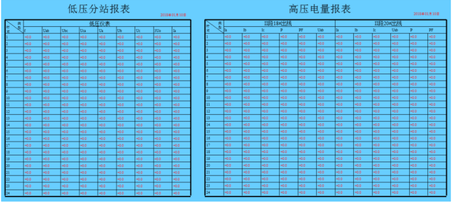 各回路或设备指定时间的运行参数,报表中显示电参量信息应包括:各相电流、三相电压、总功率因数、总有功功率、总无功功率、正向有功电能等。