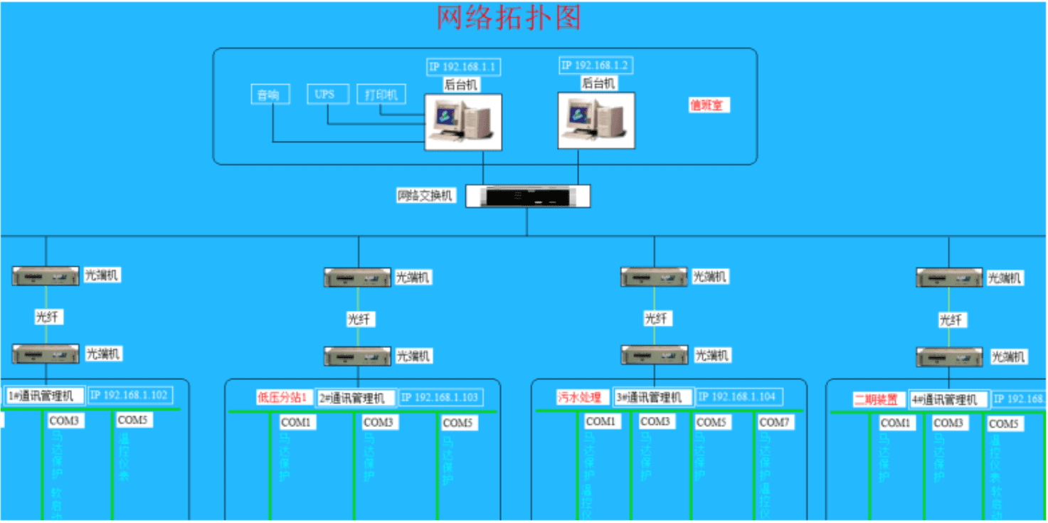 该系统支持实时监视接入系统的各设备的通信状态,能够完整的显示整个系统网络结构;可在线诊断设备通信状态,发生网络异常时能自动在界面上显示故障设备或元件及其故障部位。