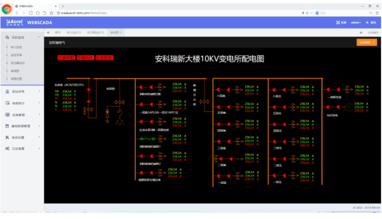 该系统人机界面友好,能够以配电一次图的形式直观显示配电线路的运行状态,实时监测各回路电压、电流、功率、功率因数等电参数信息,动态监视各配电回路断路器、隔离开关、地刀等合、分闸状态及有关故障、告警等信号。其中,10kV配电系统中监测的开关量主要有断路器分、合闸信号,手车工作、试验位置信号,远方/就地切换位置信号、弹簧储能状态信号、接地刀合分信号、变压器超温跳闸信号、髙温报警信号,保护跳闸信号和事故预告信号400V低压进线回路电参量主要有:开关状态、三相电流、三相电压、总有功功率、总无功功率、总功率因数、频率和正向有功电能累计值;400V低压出线回路主要有:开关状态、断路器故障脱扣告警、三相(单相)电流、三相功率。